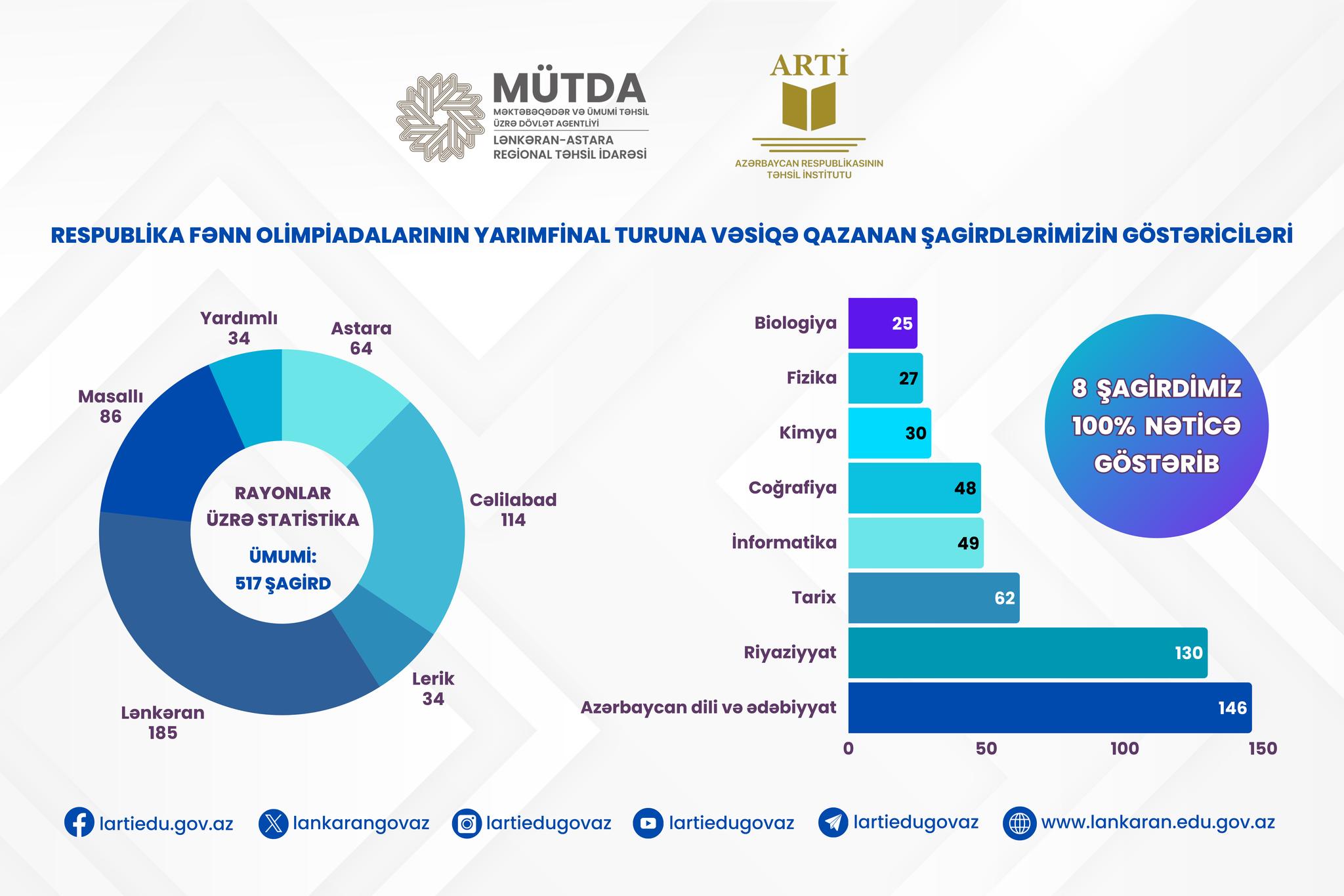 Lənkəran-Astara Regional Təhsil İdarəsinin tabeliyində olan ümumtəhsil müəssisələrindən 517 şagird yarımfinal mərhələsində iştirak etmək hüququ qazanıb, onlardan 8-i 100% nəticə göstərib.
